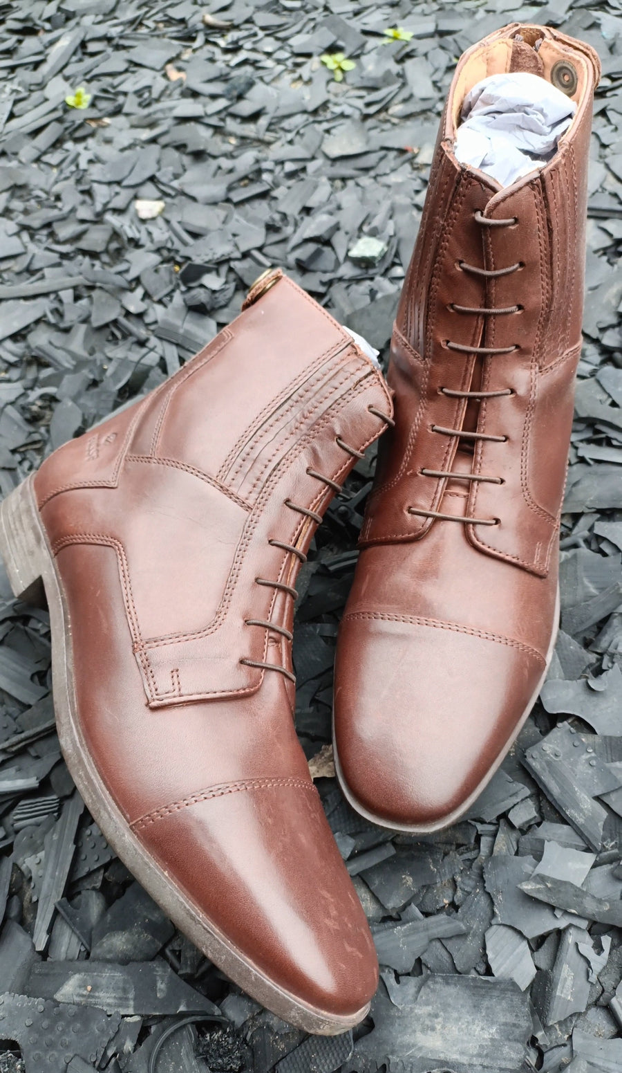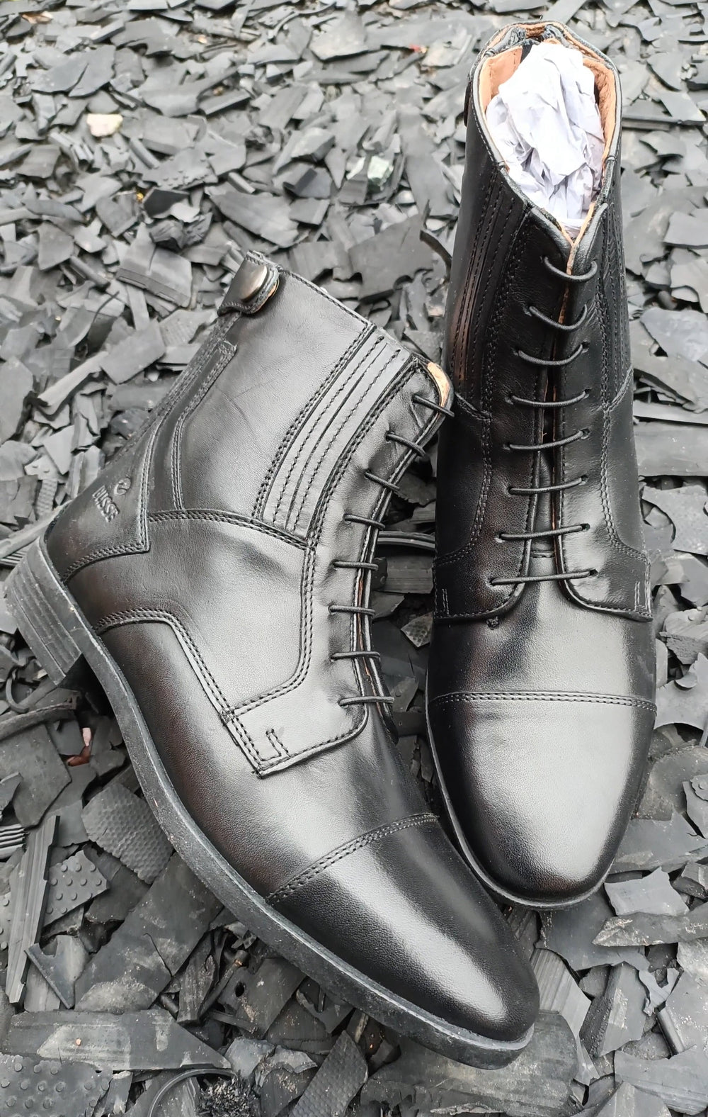 - Zamek błyskawiczny YKK® z tyłu ułatwiający zakładanie, zabezpieczony skórzanym paskiem z zatrzaskiem