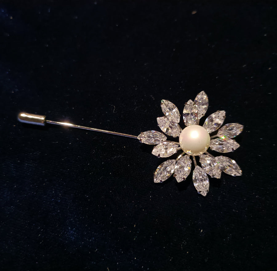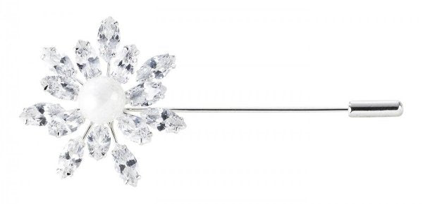 Lśniąca srebrna igła plastronowa w formie pięknego kwiatu ozdobiona dużą, sztuczną perłą