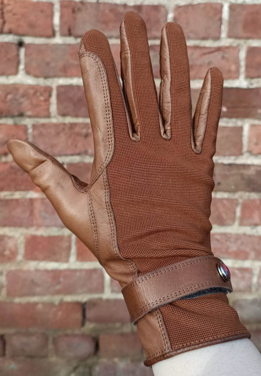- Część dłoniowa wykonana z brązowej, klejącej skóry, część wierzchnia z elastycznego i oddychającego materiału „Spandex”