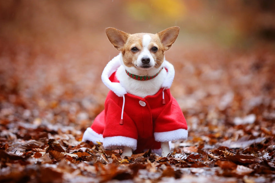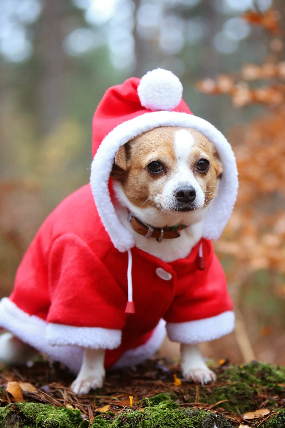 Zabawny płaszcz dla psów w świątecznym stylu. Wyraziście czerwony i wykończony białą imitacją futra. Płaszcz ma kaptur z białym pomponem i sznurkami. Z tyłu haftowany jest tekst „Merry Christmas”. Na dole znajduje się zapięcie na rzep z ozdobnym guzikiem.