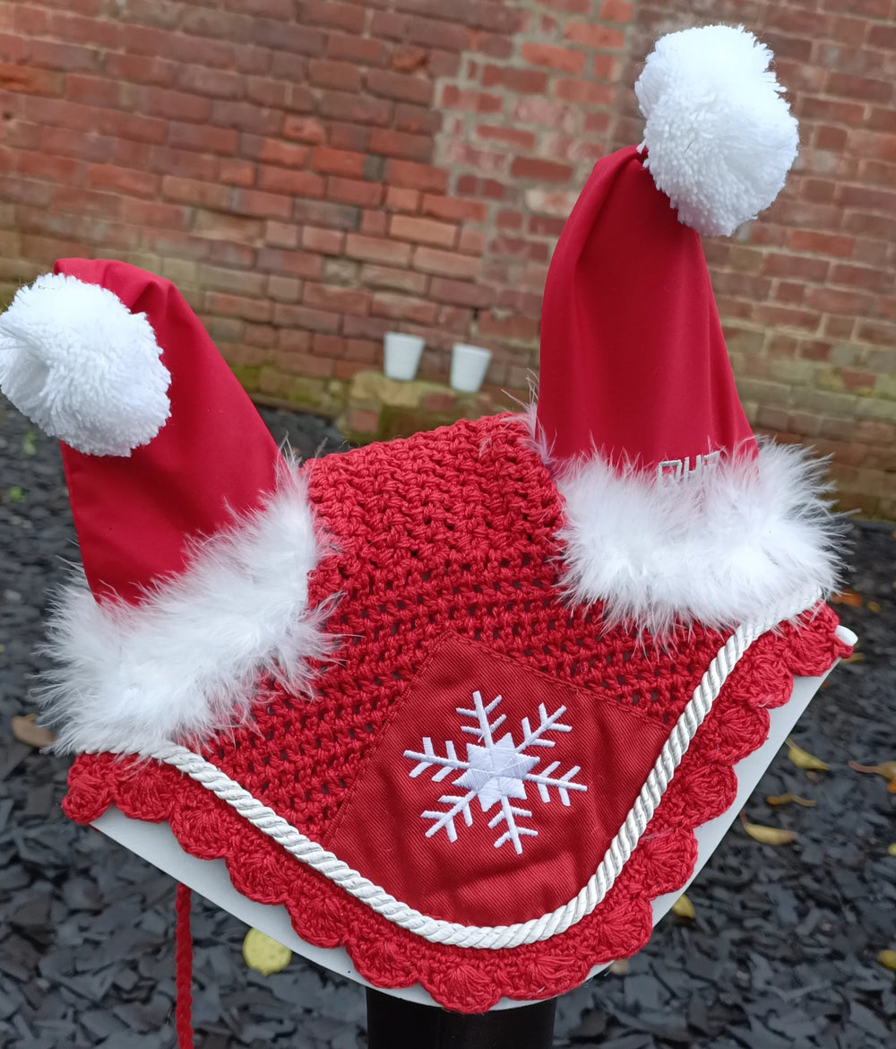 Siatka na uszy szydełkowa z motywem świątecznym. Uszy tworzą dwie małe czapeczki świąteczne dzięki białej lamówce i białemu pomponowi. Haft płatka śniegu kończy siatkę na uszy. Posiada uszy z lycry dla większego komfortu.