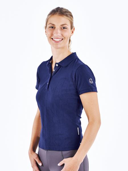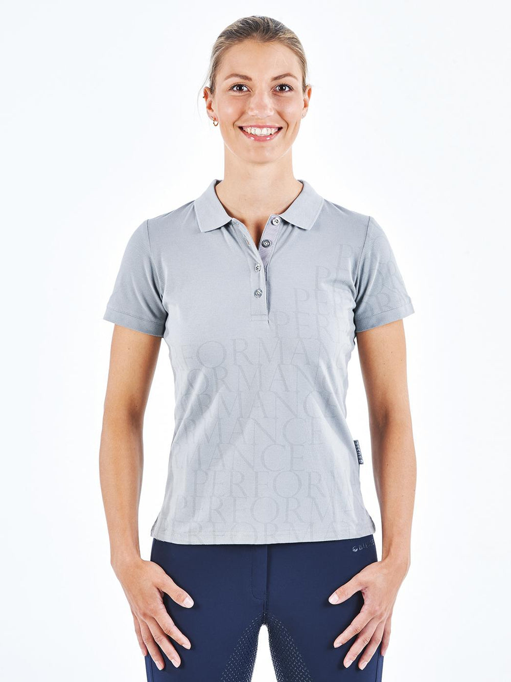 - klasyczna damska koszulka polo z asymetrycznym nadrukiem „PERFORMANCE” w tonacji ton