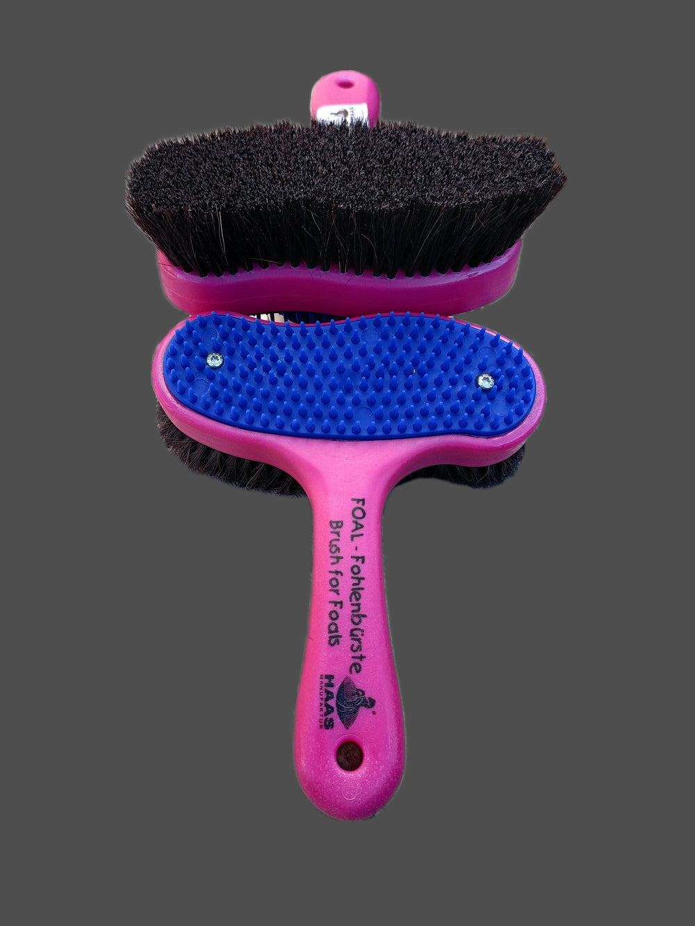 Specjalna podwójna szczotka dla źrebiąt. Z miękkim czarnym włosiem końskim po jednej stronie i miękkim masującym grzebieniem curry po drugiej stronie.
