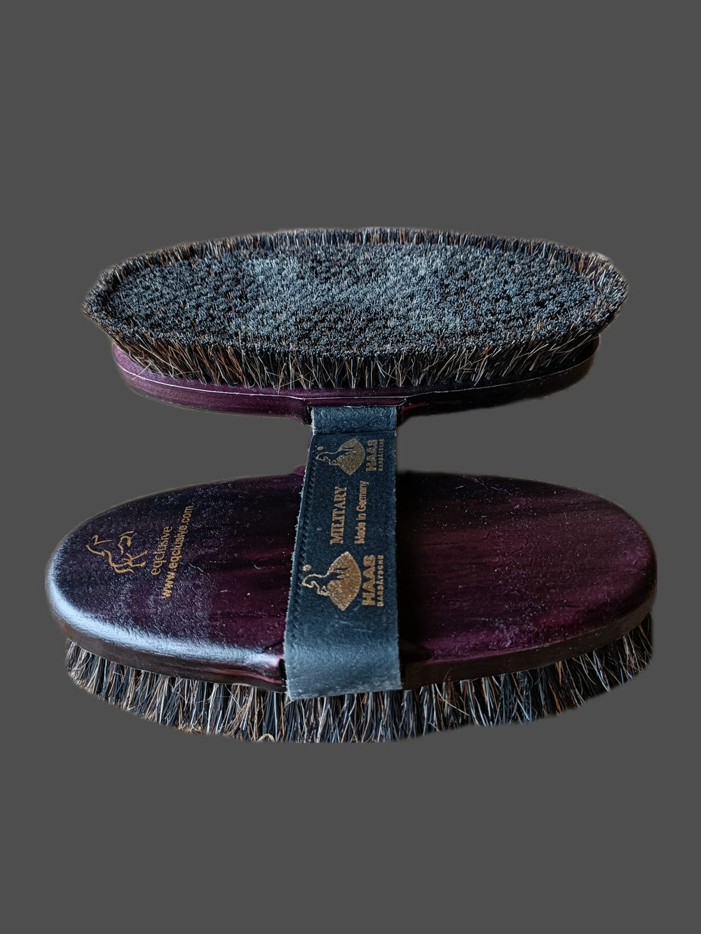 Do dokładnego czyszczenia, podczas gdy krótsze włosie usuwa kurz i wzmacnia połysk, aby uzyskać gładki, lśniący efekt. Krótsze i mocniejsze włosie zapewnia dokładny efekt czyszczenia, podczas gdy dłuższe włosie usuwa kurz i wzmacnia połysk. Niesamowita w usuwaniu kurzu z kasztanowatych koni! Miękkie, ale dobrze połączone włosie sprawia, że ​​nawet najbardziej wrażliwe konie uwielbiają tę szczotkę! Ta szczotka blokuje się w miękkiej sierści i zapewnia, że ​​każdy brud, pot i kurz zostaną przeniesione na powierzchnię sierści. Do tej szczotki użyto odpowiedniej ilości i gęstości mieszanki końskiego włosia. Krawędź jest obramowana dłuższym włosiem. Wyczyść sierść swojego konia perfekcyjnie dzięki HAAS Military Ladies! Nasza szczotka została zaprojektowana z krótszym i mocniejszym włosiem, aby zapewnić dokładny efekt czyszczenia, podczas gdy dłuższe włosie usuwa kurz i wzmacnia połysk. Miękkie, ale dobrze połączone włosie jest delikatne dla najbardziej wrażliwych koni, zapewniając, że pokochają one czesanie. Dzięki odpowiedniej ilości i gęstości mieszanki końskiego włosia ta szczotka skutecznie usuwa brud, pot i kurz z sierści Twojego konia. Krawędź pędzla wyłożona jest dłuższym włosiem, co dodaje mu jakości. Zaufaj HAAS Military Ladies, aby uzyskać gładki, błyszczący połysk za każdym razem.