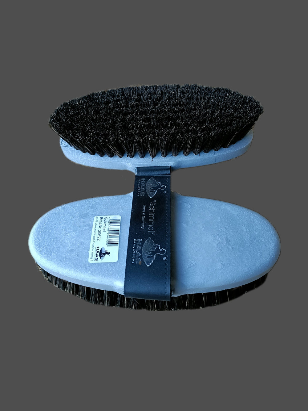 Masz potwora plam? W takim razie zdecydowanie musisz dodać szczotkę HAAS Schimmel do swojego zestawu do pielęgnacji! Ta światowej sławy szczotka Haas jest wykonana z mieszanki ściśle przylegającego, twardego włosia kokosowego i doskonale nadaje się do szybkiego i łatwego usuwania zaschniętego błota i plam z sierści konia, dając spektakularne rezultaty. Jest korzystna do usuwania plam stajniowych u siwych lub białych koni i oznaczeń - to prawdziwy wybawca do czyszczenia białych skarpetek! Jest bardzo wygodna w trzymaniu dzięki uchwytowi z prawdziwej skóry. Szczotka Haas Schimmel jest dostępna w kolorze srebrnym, w rozmiarze damskim.